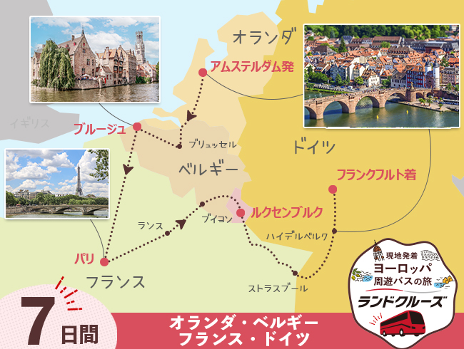 日本語現地係員が同行し、アムステルダムからベルギーを通ってパリへ移動するツアー!