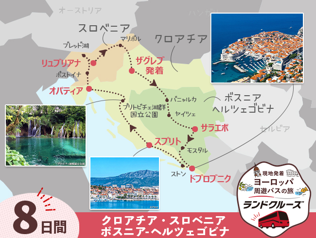 日本語現地係員が同行し、クロアチア、スロベニア、ボスニア・ヘルツェゴビナの3か国を周遊!