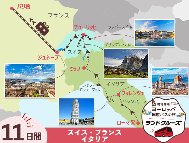 ローマからパリまで一筆書きのルートで、コンパクトに他都市を巡ります!