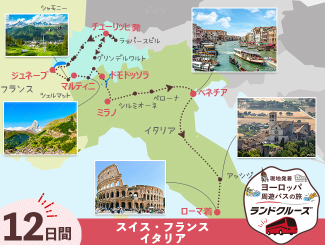 【ランドクルーズ】チューリッヒ発 スイス名峰周遊とミラノ・ベネチア・ローマ 12日間【ID:2606837】