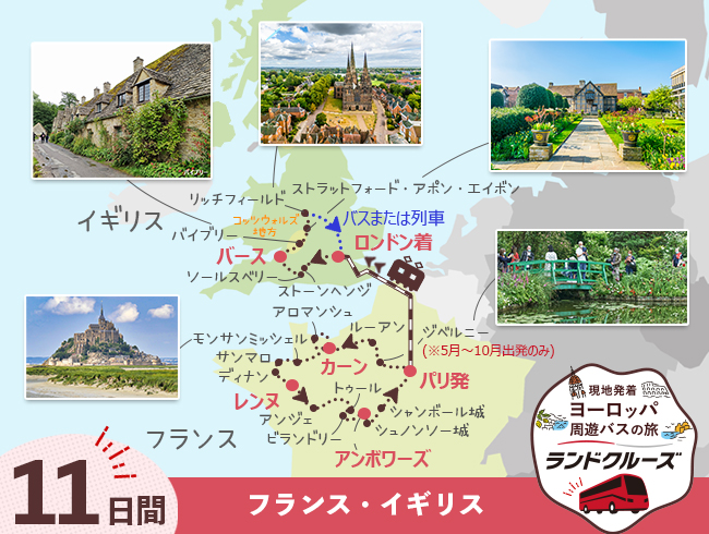 【ランドクルーズ】パリ発 パリ、モンサンミッシェルとロワール の古城巡り、ロンドンとコッツウォルズ 11 日間【ID:2608324】